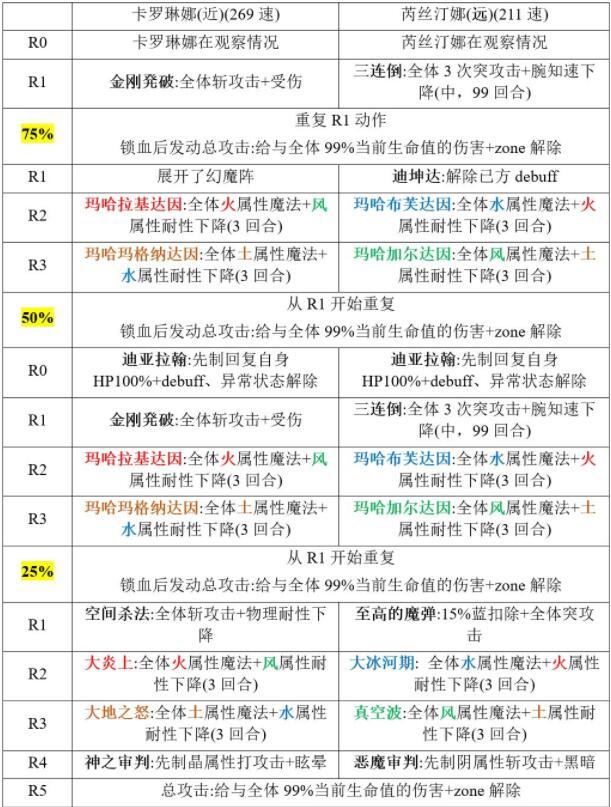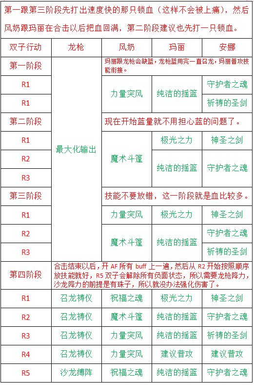 第四阶段建议对照下面的表格丢技能,一个不要错,就100%过。龙枪R5的时候必须给双子降智力,R1-R4召龙输出(大佬们的双子行动表没有提到R5双子会解除自身异常状态,所以龙枪需要给她们降力,不然即使你回满血加物理盾,你也扛不住 R1的两个很强力的物理攻击。)