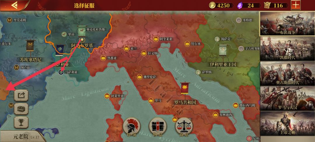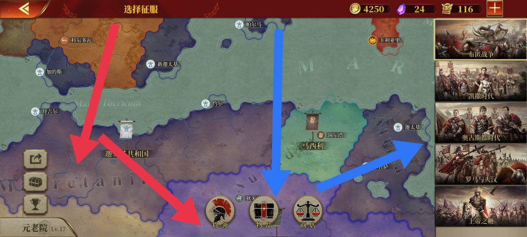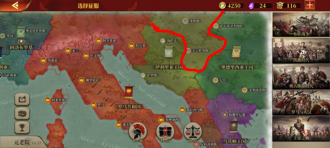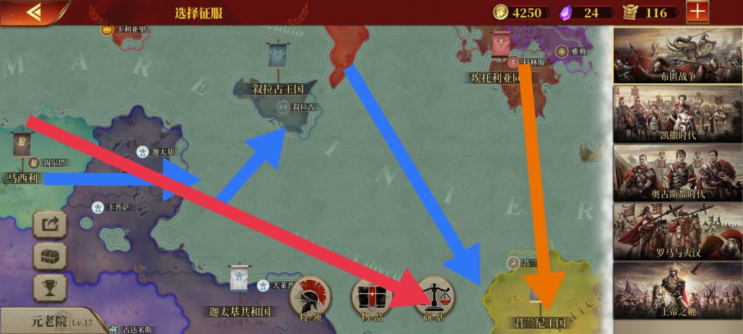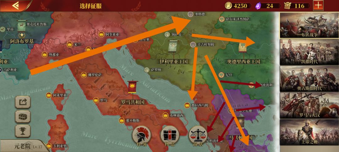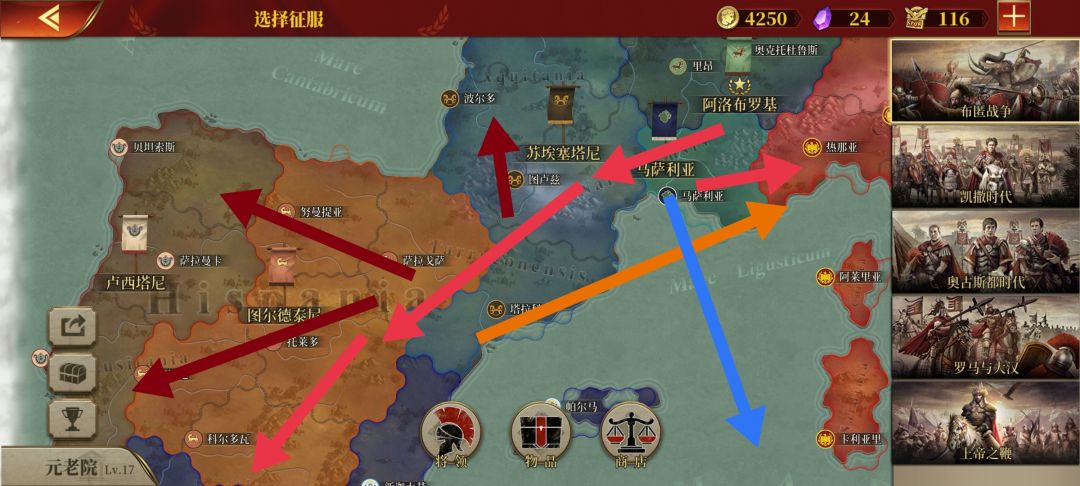 我这次玩一星国——阿洛布罗基:高卢凯尔特人部落与罗马同盟,主要敌人迦太基。我的主要攻势分成粉红(A方面)、橙色(B方面)、蓝色(C方面)如图4、5、6、7、8所示,另外一个深红色,从中抽几支分到那些小区域或者该区域抵抗很强。