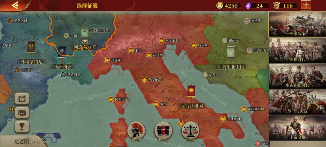 游戏开局,我只有两座城池、两只兵所以不能马上跑去比利牛斯山那与迦太基正面硬刚,我的现有战争资源、军队质量不允许,还有对方也有汉尼拔领导的战象,就算他的级别低,但毕竟是神将,所以我从20回合左右才开始进攻,等资源上来一点,把高级将领配高级兵种,这又是小国,特色兵种、科技、战术也没有。