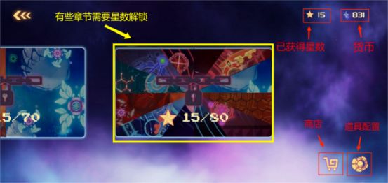 主界面包括多个章节,商店,以及道具配置界面