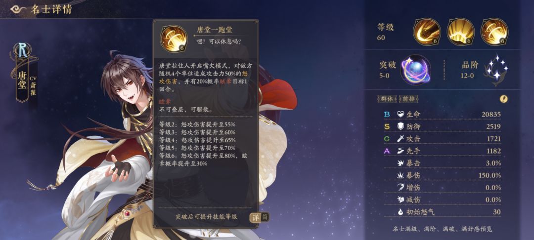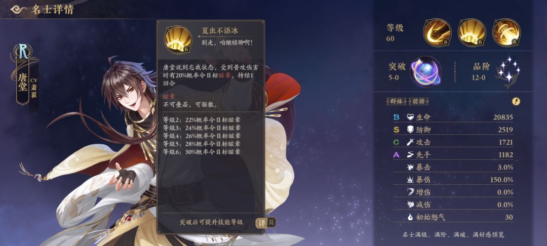 第二位,唐展。在其他攻略中应该也能看见他的身影,核心机制是眩晕,满破达到巅峰。更多的是作为一张策略卡,因为大招眩晕是全体的,运气好一下晕了三个可能本来过不去的本就轻松通过了。
