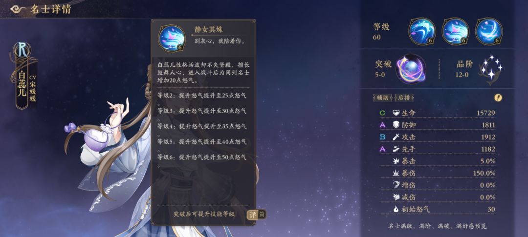 第三,白蕊儿。白蕊儿在双0怒攻队是比较适配的一个角色,满破开场一次性提供50怒气,还有一点点奶量。但个人在35级后pve使用效果不佳,在PVP的抢速意义更多。也算是前期能够使用的一个人物。