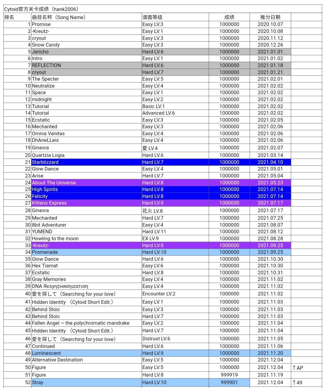 目前我已经收满了50张官谱!整理完表格(图4)之后看着右边那列日期我真是感慨万千,从去年一直走过来,真的要感谢所有人给予我的鼓励,无论是在tap还是在QQ群认识的,没有你们我都不可能达成今天这样的成就❛˓◞˂̵✧