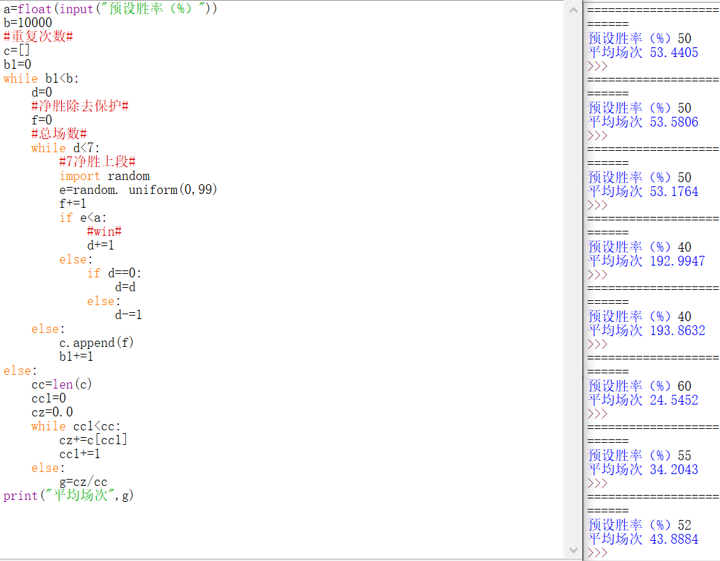 代码尝试发到楼下,复制到txt里,后缀改为py,然后安装一个python3打开就能用了,输入一个胜率回车就能算出来。(如果被河蟹了就手打吧……逃
