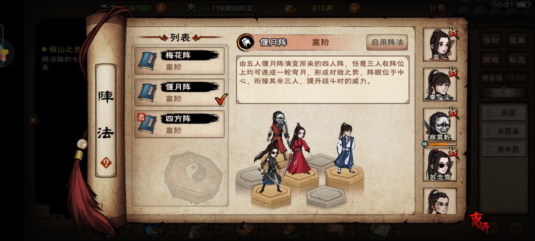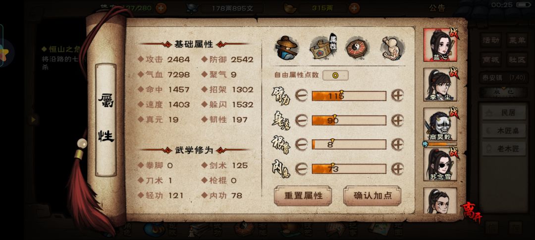 还有经脉,开脉是必须的,学内功可以开脉,药店买经脉书也可以开脉,强烈建议先把每个人的足少阳经顺脉点满,后面能舒服一些,其他的输出就优先点攻击想关的,前排就优先点防御相关的,也可以专门查查这方面的攻略,就是说的很复杂,反正我是看不懂。