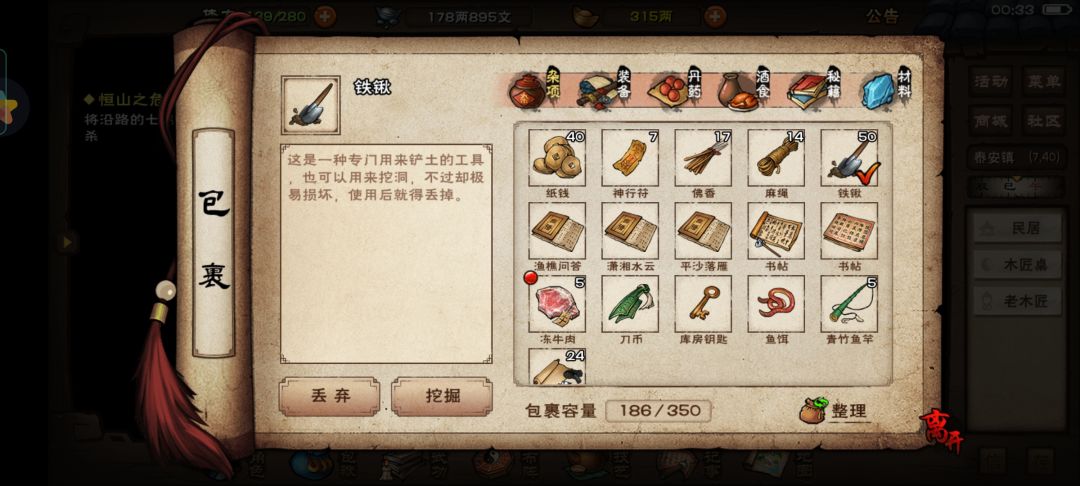 值得注意的是有些资源点采不来的道具也需要提前准备,比如可购买的常备:烧刀子20、纸钱20、绳索10、蜡烛5、火折子5、铁锹30、鱼竿6、鱼饵每天40、文房四宝20、蛇胆30、牛黄10、虎骨30、米每天5个、葱蒜每天5个,有些现找来得及不用太提前准备