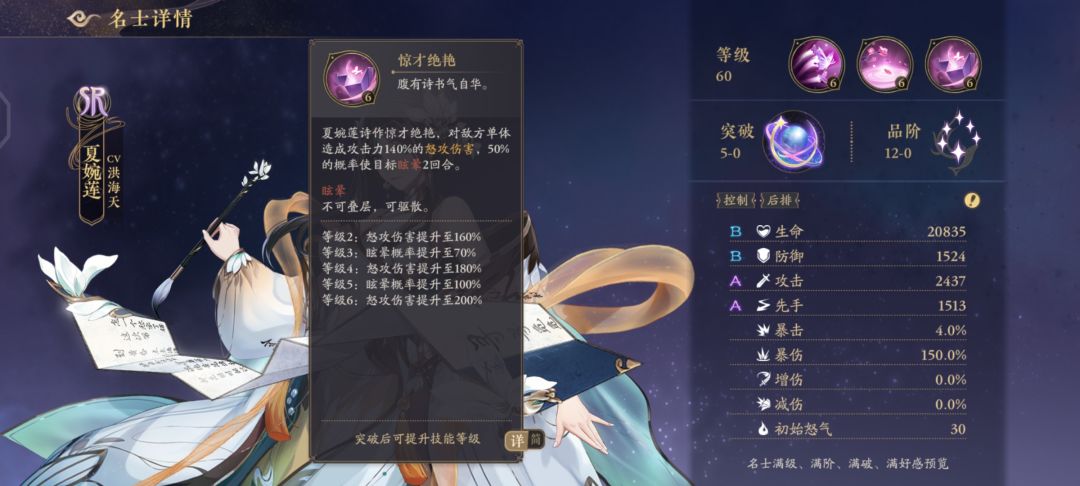 文司宥UR(回怒换位眩晕,属于一张对策卡,配合惊墨有奇效,但是对前期开荒不太友好,而且较吃技能等级,站位看对面关键的后排角色)