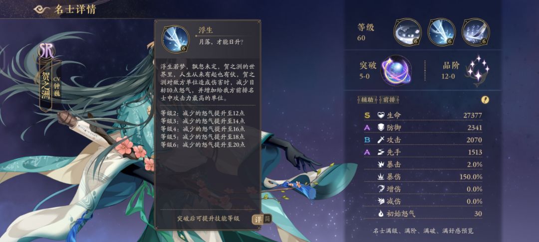 贺之洲SR(普攻就能偷怒气给前排队友,大招给盾还免疫控制,适合耶律炎SSR这种前排输出角色,推荐站位1号,5号)