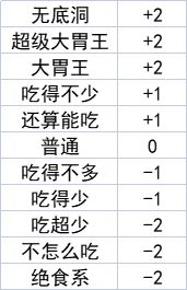 数值代表开发菜谱的时候,对分量方块的影响,0为无加成,+1或+2为增加分量方块出现概率(在气泡中显示为1或2个分量图标),同理-1或-2为降低概率,提一下,通常做小分量的菜品,不会去选择自带分量加成的菜谱,一般都是选择没有分量加成的菜谱,再此基础上,-1会明显降低消消乐中分两方块出现概率,但还是会少量有,-2则不会出现分量方块。
