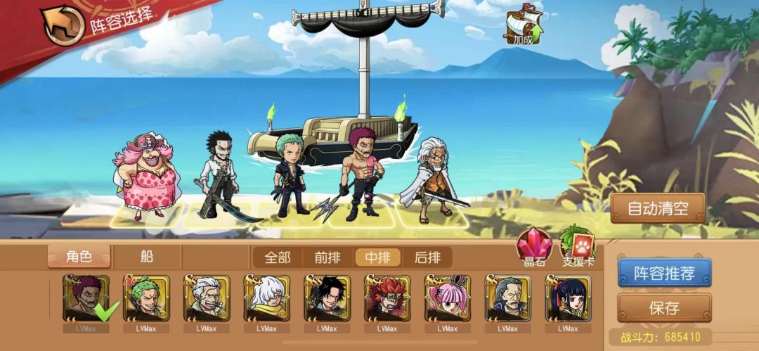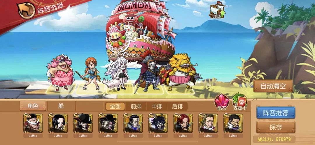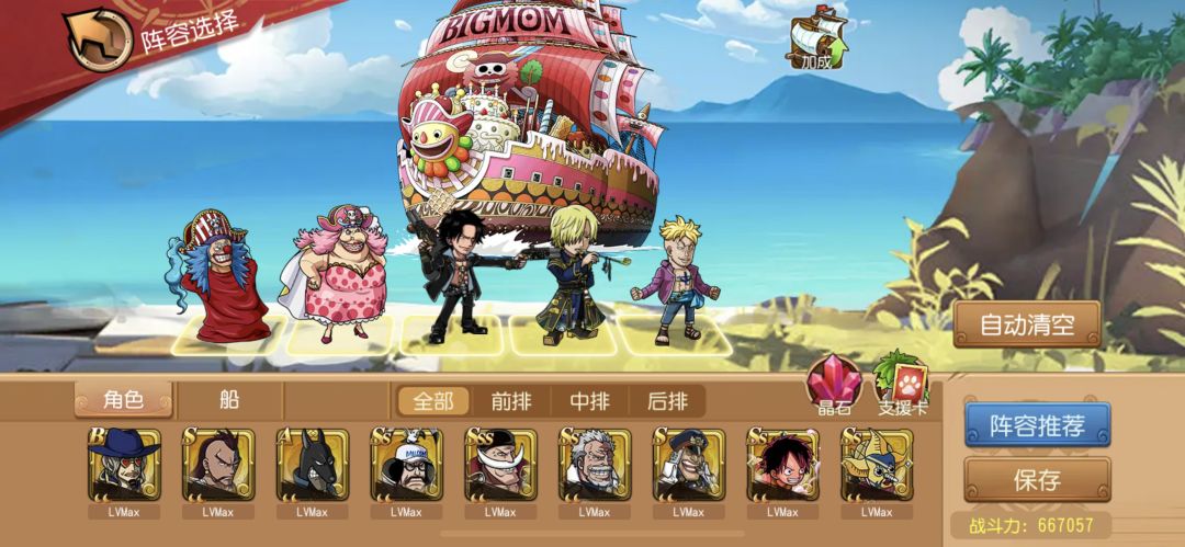 突破马尔高(法甲)+突破新世界·山智(物穿)+火拳·艾斯(法穿)+大妈(法穿)+突破七武海·巴奇(法甲)【船只:女王妈妈吟唱者号】