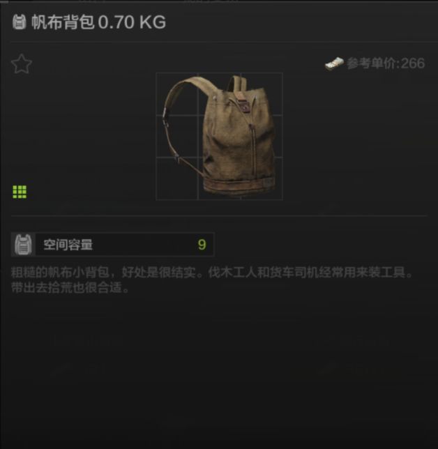然后来看看背包,背包可是主要的容量道具,这里我为大家推荐两款仓库必备的背包:帆布背包和轻型登山背包