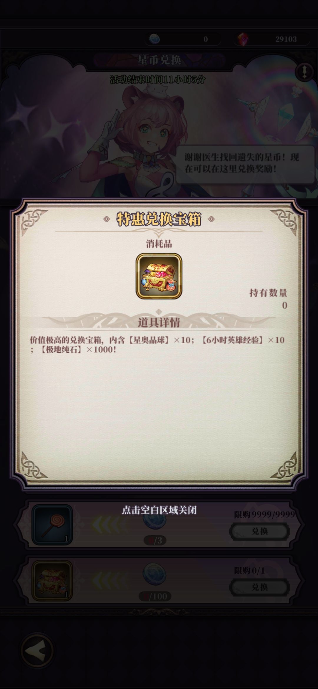 兑换策略:想换不朽专武石是必须要氪的,没得商量,个人建议兑换一个英雄+一个特惠宝箱(注意!!!请一定要看到这个宝箱,奖励巨丰厚!!)剩下的73星币随便换点啥吧。如果没有特惠宝箱的话可以兑换一个英雄+传奇自选宝箱/四个卓越自选宝箱(玲)