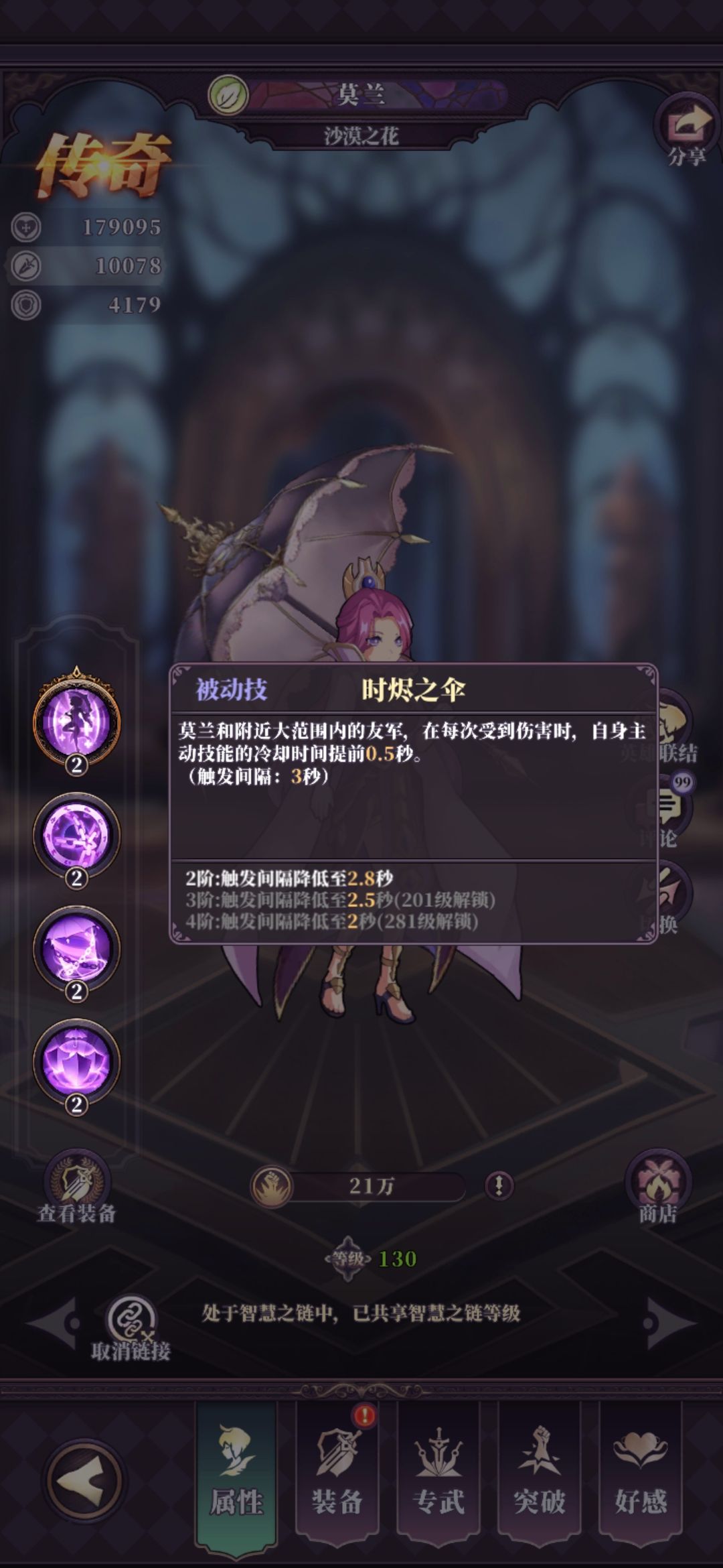 阵容方面必带的是莫兰,不多赘述技能,我直接放图。需要注意炮姐的技能在141级时能再减一秒CD,想打极限一点的朋友可以考虑重制一下主阵容堆一下炮姐。