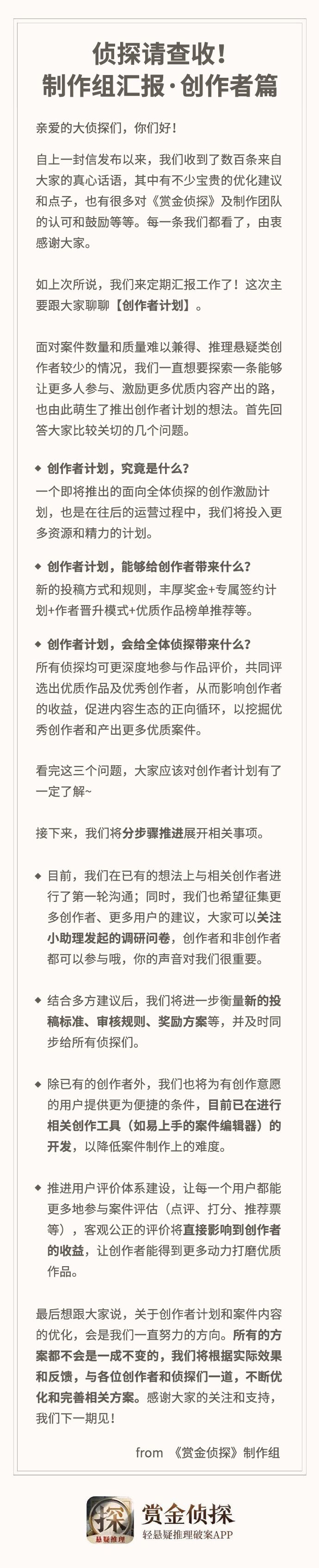 好消息~好消息!各位侦探一直惦记着的内容优化方案【创作者计划】,策划大大们已经在日夜赶工啦(听懂掌声👏)关于这个计划大家可能会好奇的、想了解的内容,制作组都已经整理在交流信中,后续也将陆续放出更多具体信息~👉戳
