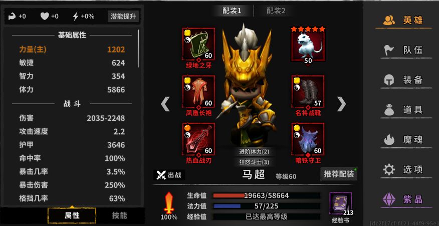 解释这两个人装备原因:刘备只要肉就行,装备90减伤,两条防止流血,头盔抗性,词条不动三个精英伤加上300抗性词条,攻速比诸葛快就可以,实际测试小怪打不掉血反而回血,刘备被动减伤且激励回血,魔魂角斗士或者角斗士杂狼或者纯狼,看个人需求。马超,技能设置41224,秒怒加后排盾,怼血量,大词条攻速,攻速1.7就行,但是我觉得越快越好毕竟多点速度可以早点开盾,建议2.0攻速,词条4个速度一个20体力,魔魂推荐兔子➕眩晕➕冰晶龙➕冰魔狼。