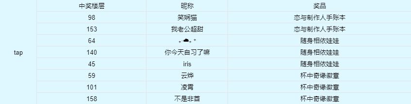 恭喜以上制作人获奖,请联系叠纸福利小助手:1917924997,提供详细地址。我们会在收到地址的7-10个工作日内寄出哦~添加时请备注:社区名称+获奖昵称