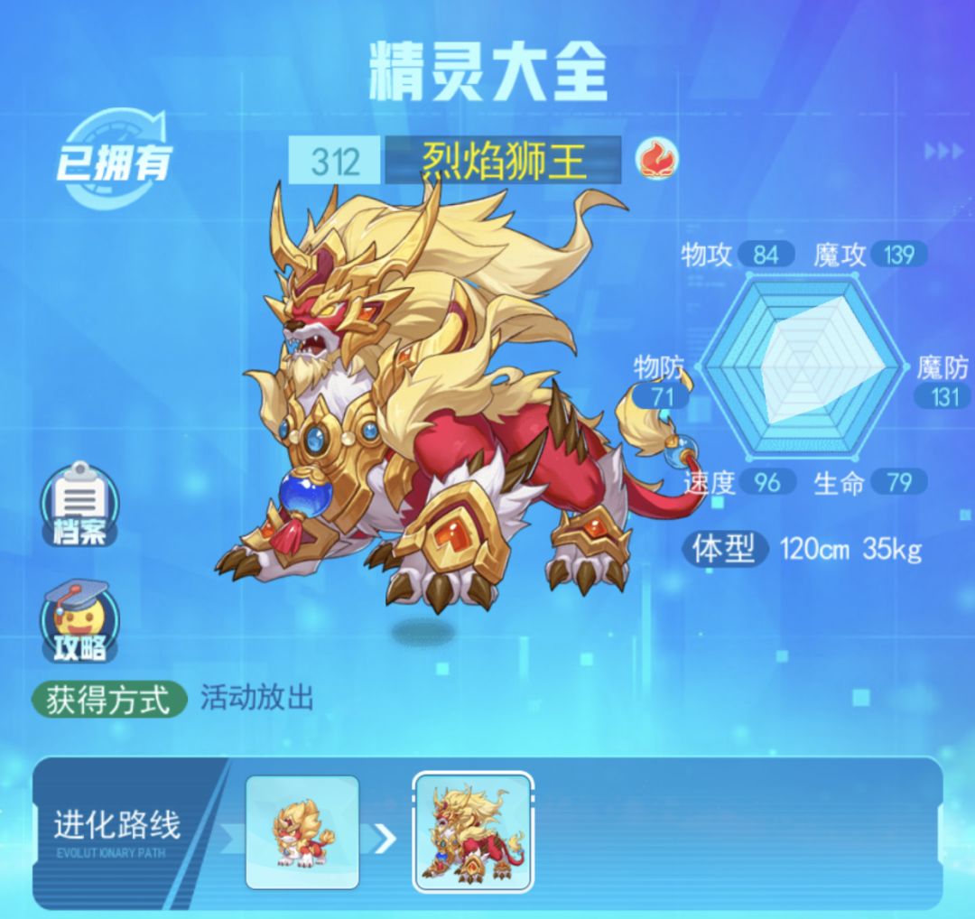 获得方式比较简单,兄弟们在游戏里的次元神殿活动中,通过抽奖就可以获得精灵碎片,幼狮和狮王都是4块碎片即可获取,活动中一共有16个奖项,其中有四个奖项是幼狮/狮王的碎片,活动介绍中标注所有奖项的中奖概率都是均等的,也就是不存在要把所有次等奖项都抽完之后才能拿到碎片这种潜规则,幼狮形态的抽奖一次是花费2颗聚核,狮王形态进化是一次4颗,我自己反正是吃了个保底hh~但是正常很多玩家都是不保底的,基本上80-90的区间出比较多,然后保底是96聚核就能把所有奖项拿完,也就是96聚核必出狮王,运气好的话,60-70聚核拿下狮王,也不是没有可能哦!