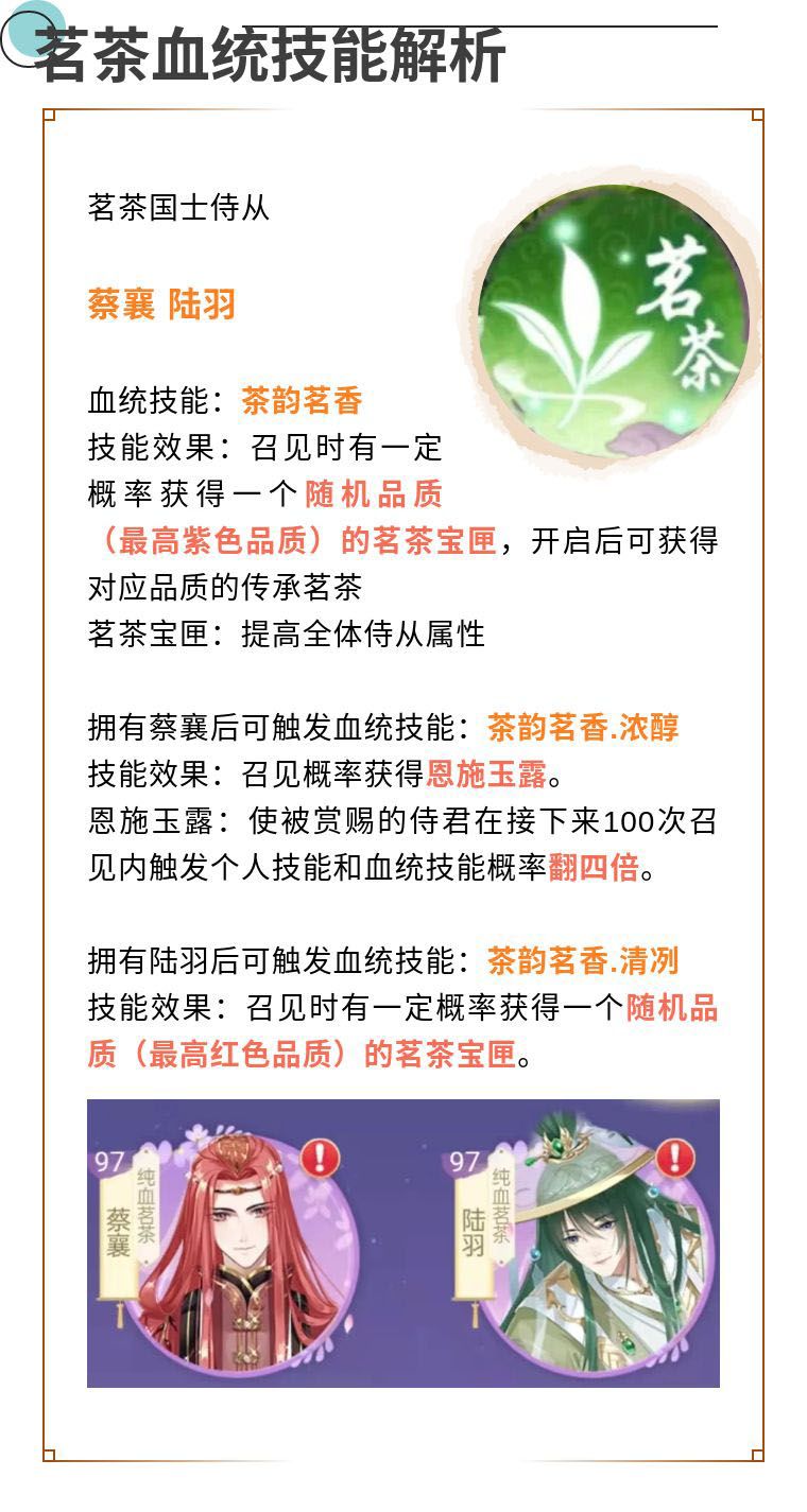 今天介绍的这一类侍从血统技能为:召见时概率获得随机品质的传承之物,可用来提高全体侍从属性。传承之物共有五种,凤瓷、茗茶、宝玉、弈棋、青铜传承之物。在【藏书阁】—【传承】中可以查看这些传承之物的具体简介。