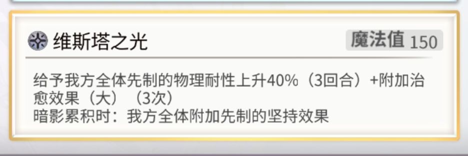 核心技能就是这个先制免死了,一场战斗中有且仅有开场时自动积累一颗暗影,之后没有办法获取第二颗,国服很长一段时间不会有技能带先制效果的boss,所以这个先制就等于开场必定先手给全队一个一次性的坚持效果(受到致死伤害时保留1滴血)