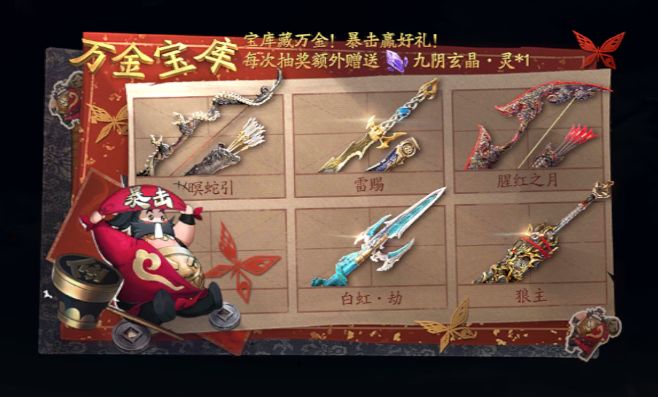 少侠每次使用1个宝库钥匙进行1次抽奖,额外赠送九阴之秘活动道具「九阴玄晶·灵」*1,可随机获得「神兵礼包」、「武器碎片」、「上品百炼金」等宝库藏珍之一。其中标记“甲等”的奖励为本期活动甲等奖励,宝库中共有3种奖励: