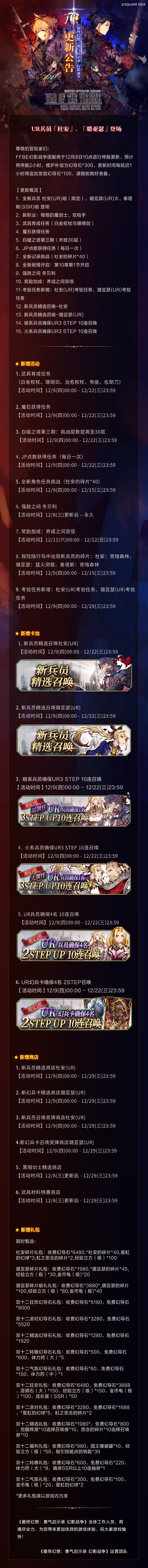 FFBE幻影战争国服将于12月8日10点进行停服更新,预计将停服2小时,维护补偿为幻导石*300,更新时间每延迟1小时将追加发放幻导石*100,请各位冒险者提前做好准备~