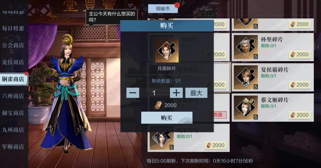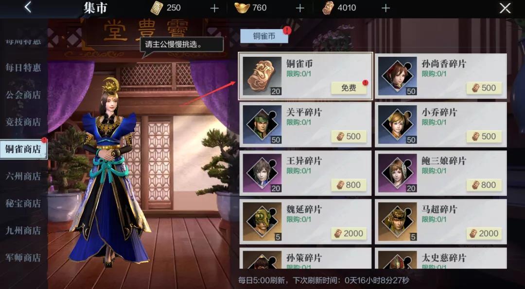 当我们获得铜雀币之后,就可以前往铜雀商店进行碎片兑换各种道具了。