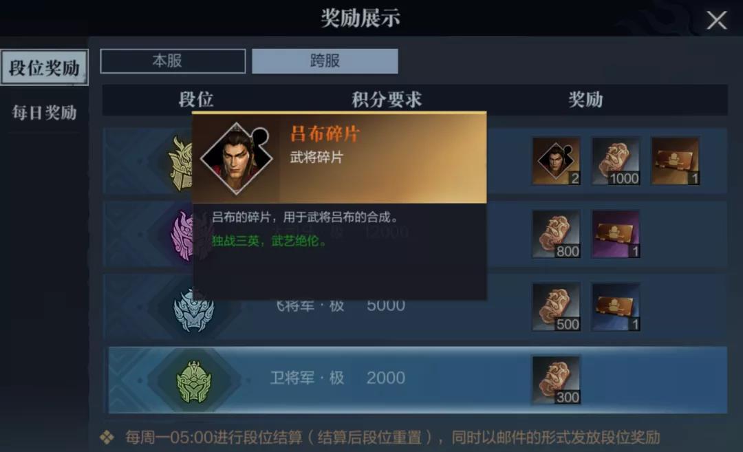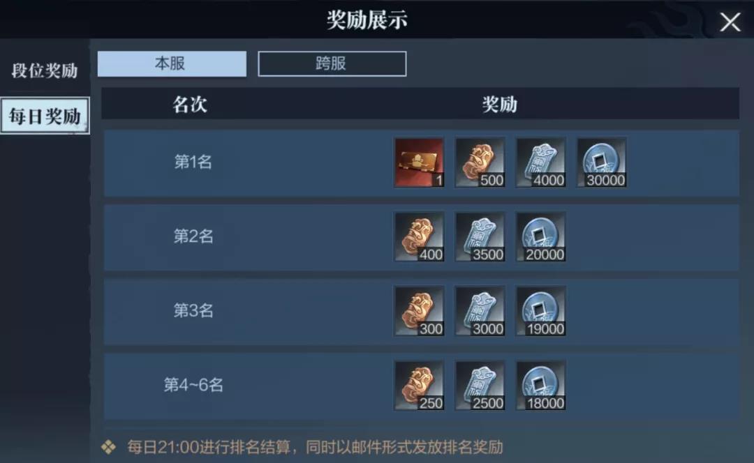 除了段位奖励之外,根据排名每日也会有相应的奖励,结算时间是每日21点。从第一名至前八千名,铜雀币、本服积分以及银币是必得奖励,排名越高奖励也就越多。