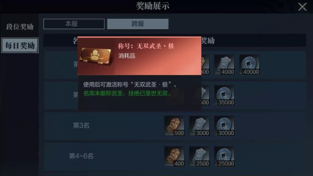 每天结算时的第一名还将获得无双武圣称号,使用后可以获得高额生命值与攻击力加成。在跨服玩法中,每日奖励获得的银币与铜雀币将会增加,无双武圣称号升级为极称号。