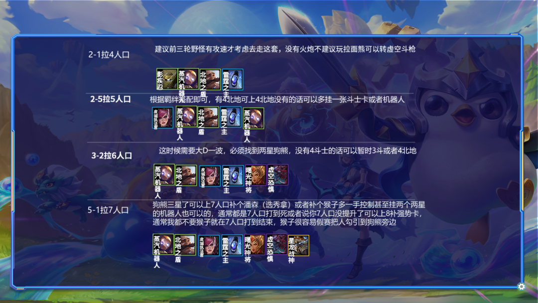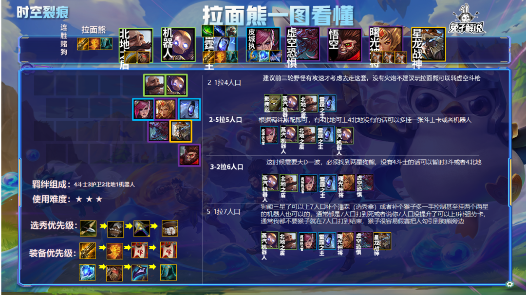 Hello,大家好,我是猫呦,你们最近一直都在说发重复阵容,版本强势阵容就那几套,每天的环境都有可能会变动,我只能给你们把当天适合上分的阵容推荐给你们,我推荐给你们的阵容都是我自己的上分阵容,这个版本总之就是独家就是版本答案,自己多观察外面什么阵容没人玩不就得了吗,今天给你们推荐一套你们一直叫我测试的阵容--拉面熊,拉面熊不属于T0顶多算个T1阵容,可能玩个十局才会见到有人玩一局,毕竟需要火炮,有火炮我去玩男枪不香吗,通常都是开局有攻速,然后优先男枪,2-4选秀没铲子或者石头人没给铲子就转拉面熊就好了。