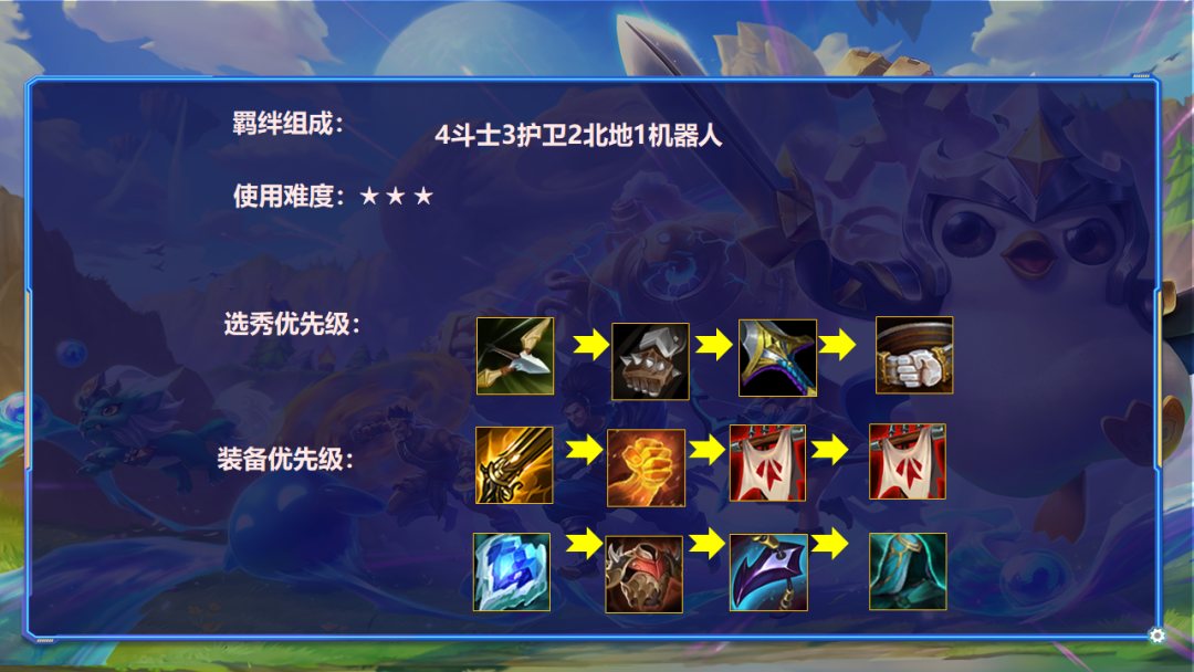 前期有攻速才考虑去走这套阵容,建议优先考虑男枪,其次才是拉面熊,2-4选秀如果没铲子就拿攻速做火炮转拉面熊或者转斗枪都可以,必须要有火炮,如果你有条件做两个火炮就最好了,双火炮+降星刀的快感你可能没体验过吧。