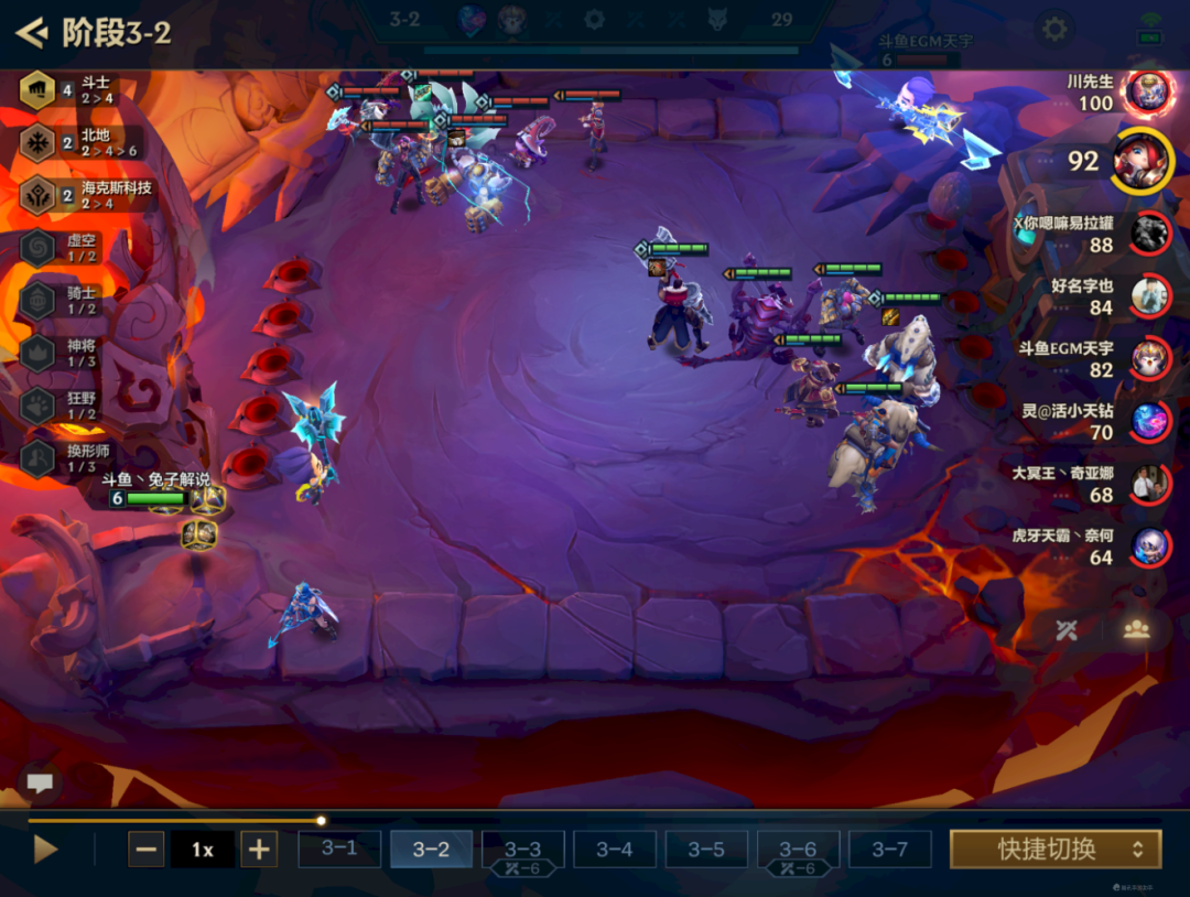 3-2拉6人口,梭哈找到4斗士+两星狗熊为止,可以看到我前期血量稳的很好,这时候还有92血,这时候我就可以不用继续D了,3阶段足够了,存钱卡着50利息慢慢D三星狗熊+三星机器人+三星楚雨荨+三星布隆即可。