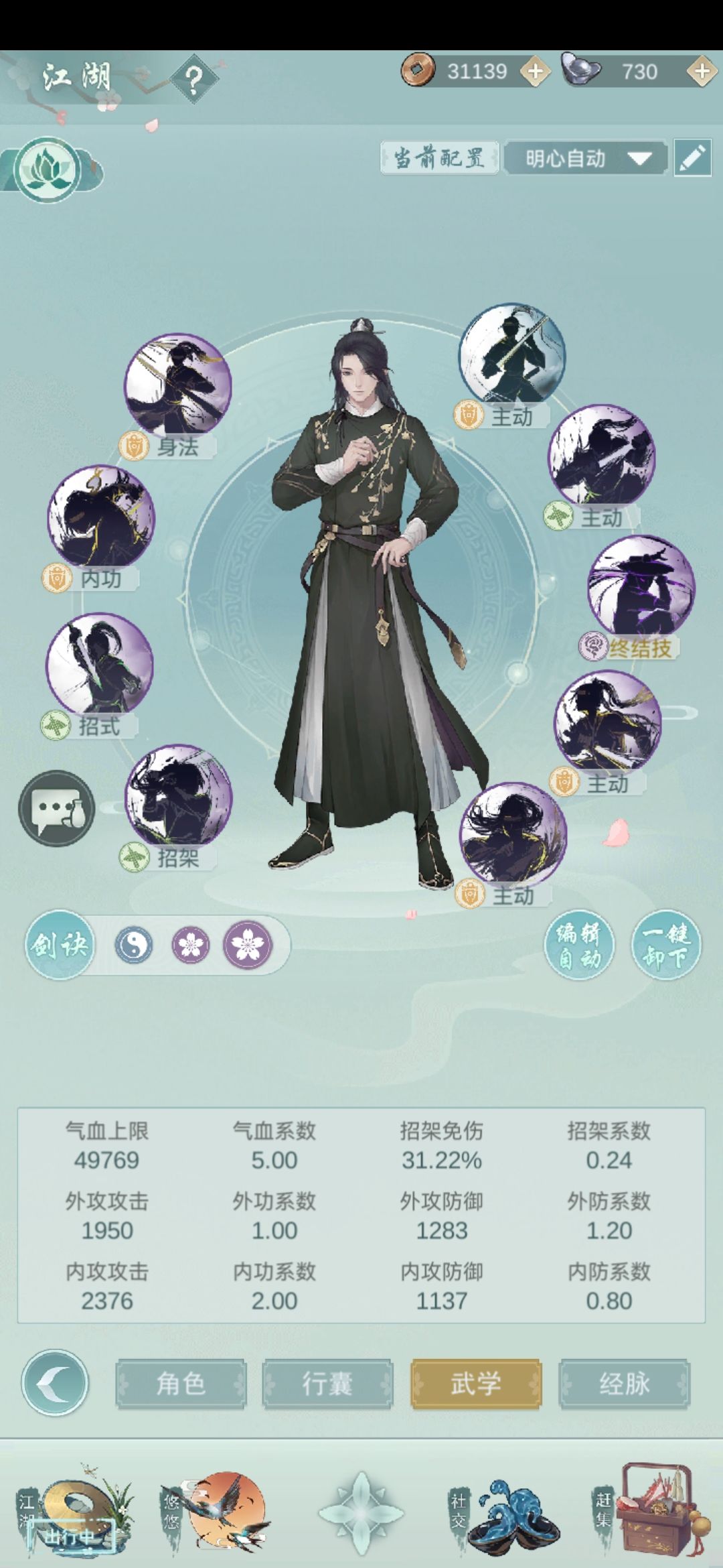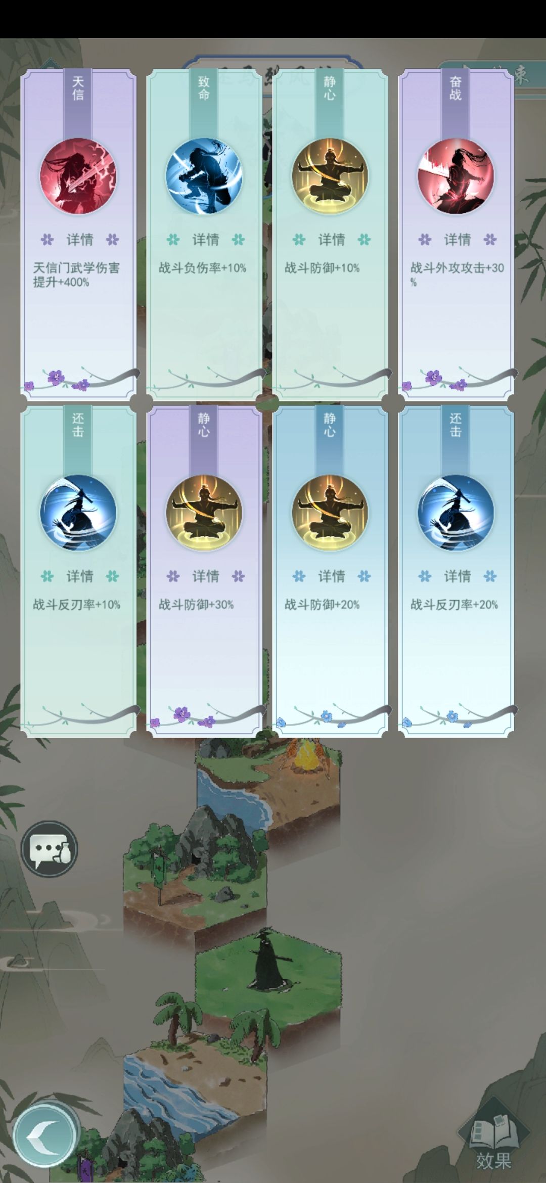 所有江湖被动留一套,方便快速置换成其他门派。如果不小心遇到了相反门派的禁地,可以尝试用心法置换成其他门派进行挑战,武学阶级要求不高一二阶就能过
