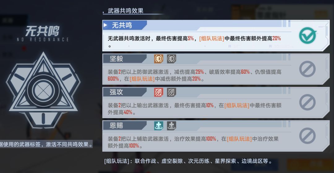 3. 等级与背包:显示的是角色当前的等级,而点开会进入背包界面,也可以通过快捷键B进入4. 共鸣:装备两把及以上同类型武器,激活对应的武器共鸣效果