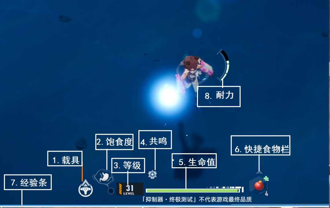 7. 经验条:在人物界面也可以查看的,这里显示在底部,也是方便大家查看自己距离升级所需经验。8. 耐力:耐力就是大家在飞行,游泳时候会进行减少,而游泳时候如果没有耐力就会扣除血量哦,而耐力也是有提升方法的后续会进行详解。