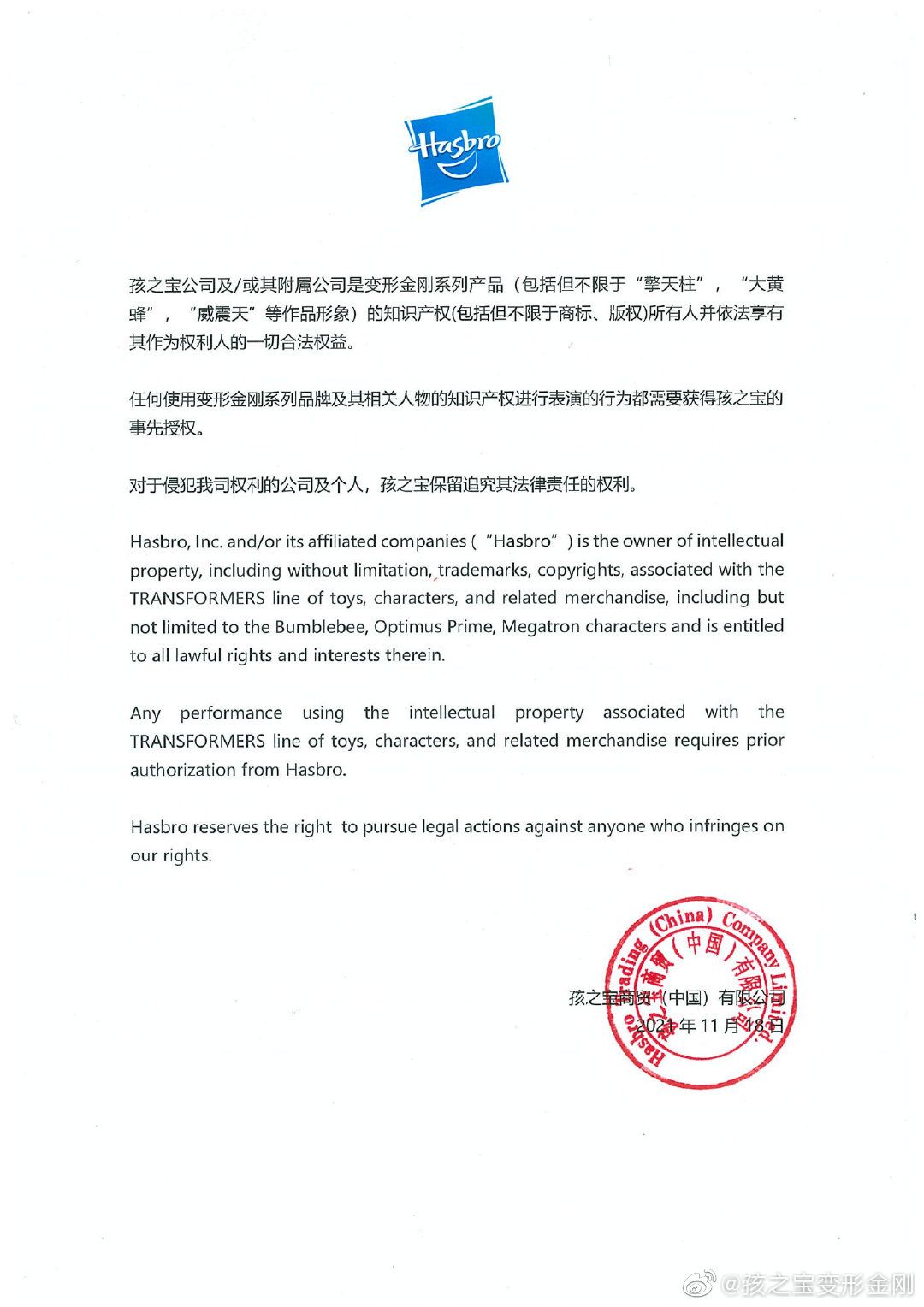 任何使用变形金刚系列品牌及其相关人物的知识产权进行表演的行为都需要获得孩之宝的事先授权。对于侵犯我司权利的公司及个人,孩之宝保留追究其法律责任的权利。