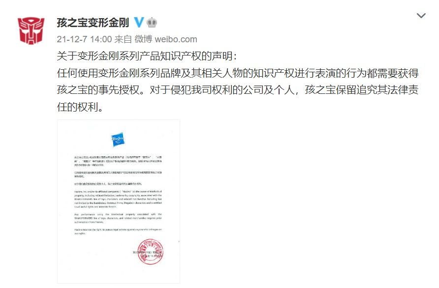 近日,孩之宝官方发声明严正警告盗用“变形金刚”IP侵权行为,孩之宝表示,对于侵犯“变形金刚”IP的公司以及个人,会追究其法律责任。