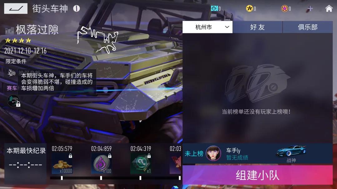 街头车神『王牌赛车学院』将于12月9日23:59结束,街头车神『枫落过隙』将于12月10日8:00开启,并附带规则『脆弱身躯』—— 『本期街头车神车手们的车将会变得脆弱不堪,碰撞造成的车损增加两倍』“所以,敢于挑战无损过隙吗?”