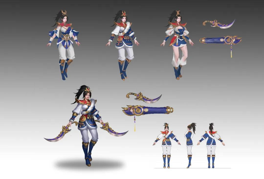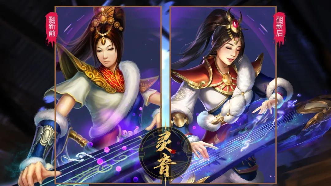 灵音的升级也更注重在细节方面,肩甲、上衣、鞋子的大量细节上的改动,虽然整体上并未改变灵音的造型,但使得灵音看上去更加的干练,另外由于灵音总是奔波于战场之上,所以灵音的武器,两柄短刀和琴,被重新进行了设计,也都更加贴合灵音的整体造型。