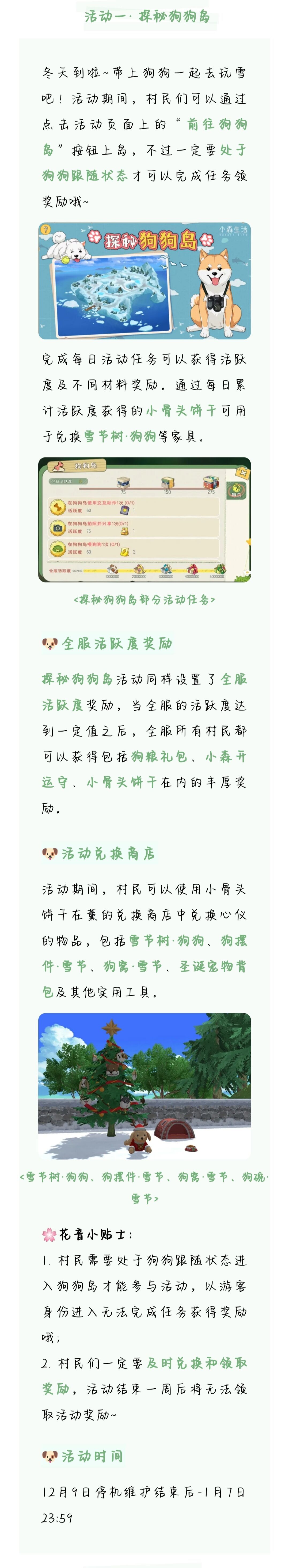 村民们好呀❄小森生活12月更新来了!村民们期待已久的雪夜主题服饰和家具终于要上线啦,新一期的丰收季和海岛活动也将同步开启~接下来随花音一起了解下更新后的第一周会有哪些活动吧♥