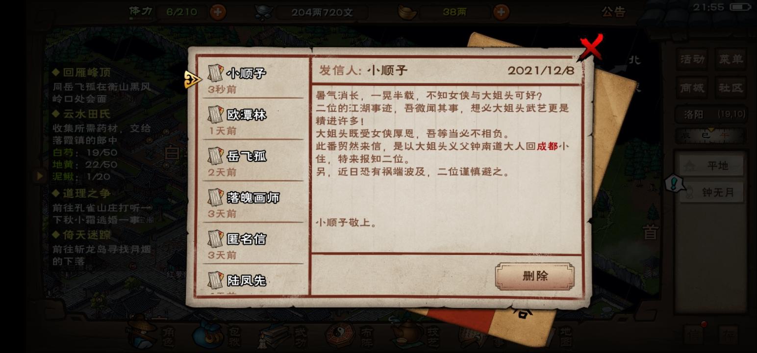 好家伙,我去洛阳挖白菜的时候触发了钟无月的天赋任务,然后钟无月离队了我自己还不知道,然后去六扇门接任务,战斗的时候发现我的小月月哪去了?看到来信我猜应该是钟无月的任务然后就去查攻略,攻略说去凝萃园,按照来信说的我在成都找了半天,结果半个人都没有......后来才知道我把小月月丢在洛阳......对不起,我下次还敢🙏🙏🙏