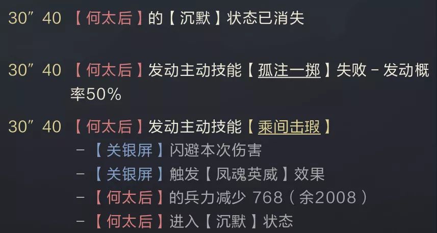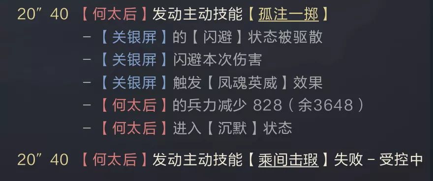 如图中何太后发动技能后关银屏成功反击并沉默。有效的限制了其第二个技能的发动,但沉默的时间与敌方的技能CD相同,并不能对其第二次释放技能造成有效限制。若沉默触发在第二个技能,沉默效果也无法持续到第二轮技能周期。所以这类武将在实战中最大的作用是扰乱敌方输出链,通过在敌方输出过程中插入控制来限制其后续技能发动,但若敌方的技能并没有联动顺序,那么沉默的实际收益会非常低,甚至大多数多属于无效沉默