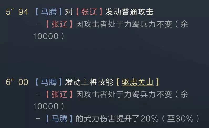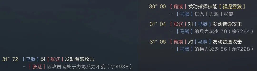 即使驱虎吞狼开局的力竭失效后,后续驱狼吞虎的力竭触发后依旧有效,因为力竭来源的驱狼吞虎优先判定大于驱虏关山,但其他力竭来源会被马腾免疫。类似于这类状态覆盖的案例很多,如关平的自带技能为被动,他的生效优先级大于指挥技能,有几率躲避荀彧、画地等开场指挥技能的控制效果。