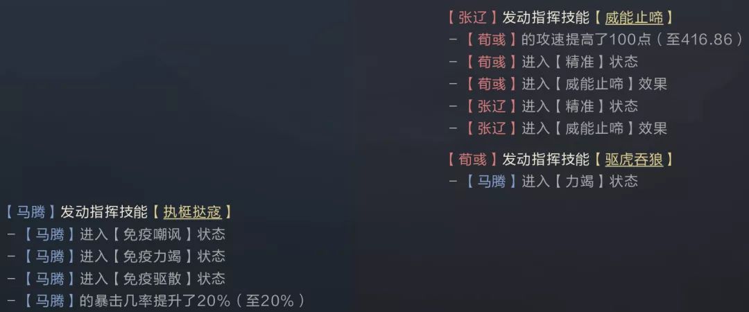 如本场战斗中,荀彧、张辽、马腾的技能均为指挥类,当张辽速度高于荀彧时,威能止啼会优先发动,为荀彧提供100点攻速加成,此时荀彧的速度大于马腾,所以驱虎吞狼会抢先发动,让马腾进入力竭,即使马腾发动技能进入免疫力竭状态,但实际上已经被力竭成功。