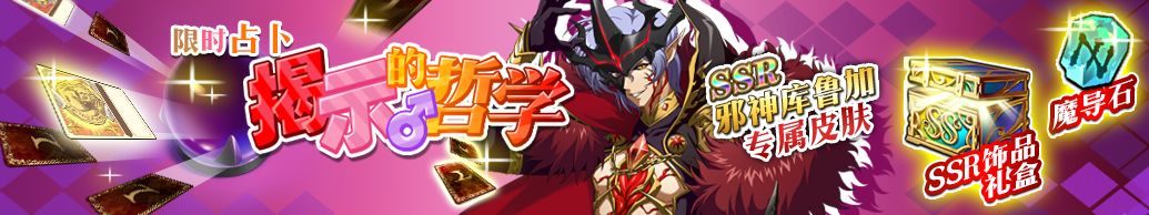 活动期间,消费一定的圣魔晶,赢取福利大奖。往期哲学皮肤限时复刻,大奖为包含SSR英雄邪神库鲁加限定皮肤「血色共鸣」在内的6选1皮肤礼包!