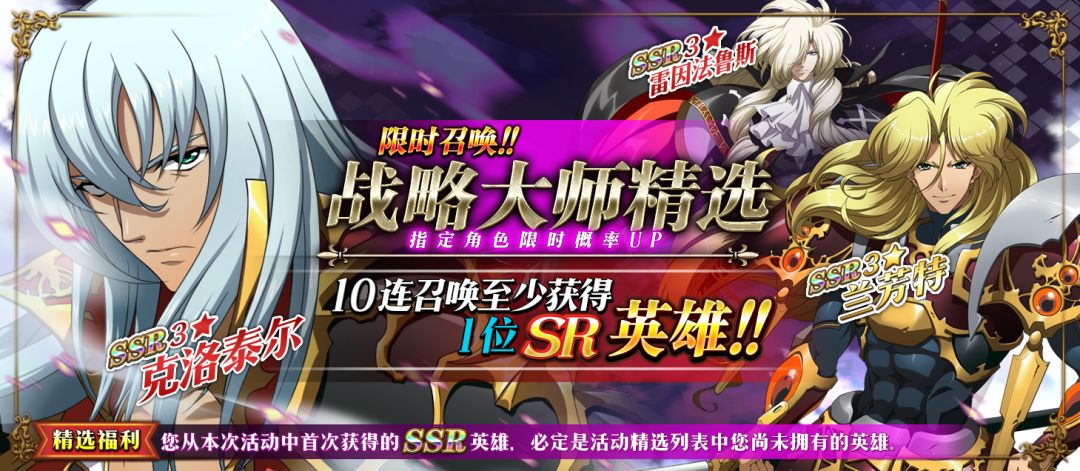 限时召唤「战略大师精选」中SSR级英雄克洛泰尔、兰芳特、雷因法鲁斯出现概率提升!
