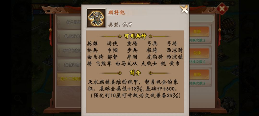 先来谈谈麟将铠的强度吧 特性一基础全属性加18%单属性加18%装备很多定制衣服铠甲黄金铠甲都有单属性18%全属性18%意味着比其他装备多出四条属性,对于综合五维属性高的武将收益特别高 没有交叉 特别适合董卓 孟获 姜维 邓艾 周瑜等五维比较高的武将 全属性加18%非常强例如周瑜让你的防御士气爆发更高可以抗更多的伤害暴击率被双击率等等全面提升