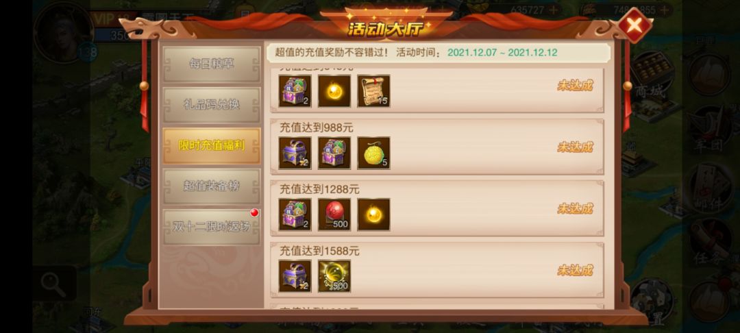 方案一 双十二礼包一个 可领取 648充值档奖励 兑换 军神衣1个 蚀月剑 1个 方案二 双十二礼包一个,98元七彩晶石礼包三个 ,68大月卡一个 可领取 988充值档奖励 兑换 麟将铠 一个 方案三 双十二礼包三个 ,98七彩晶石礼包三个 可领取1588充值档奖励 活动道具可兑换 麟将铠 蚀月剑 军神衣 各一个 在此祝大家双十二快乐