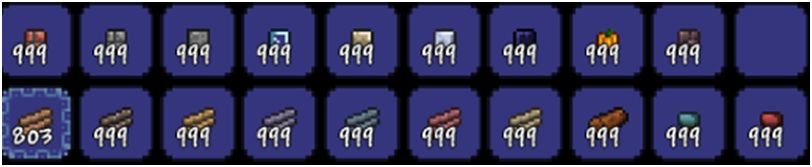 从下到上,第一排防随时会用到的物品箱子。我个人习惯是肉前矿物,肉后矿物,材料箱,肉前怪物掉落,肉后怪物掉落,草药箱摆在工作台,铁砧,熔炉,工匠作坊正下方。