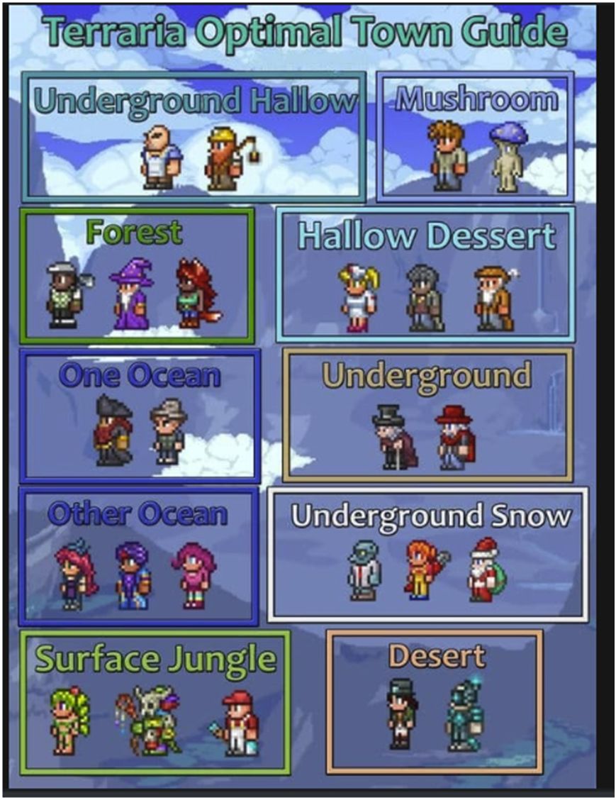 这种排布并非绝对,只要保证NPC在它喜欢的环境或喜欢的NPC旁边,并保证该区域内有2~3名NPC即可。
