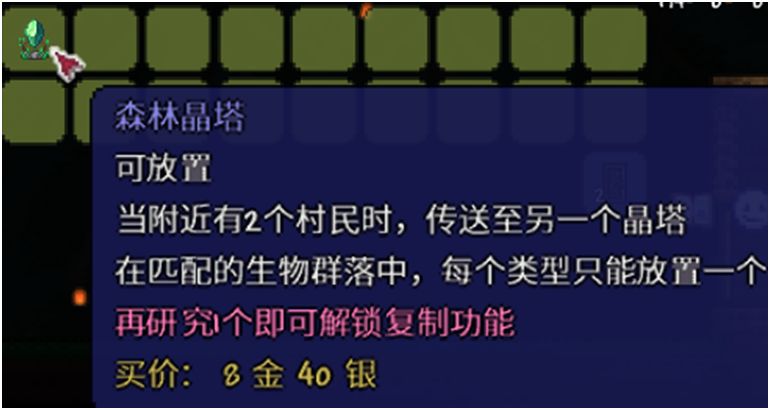 此外,当NPC快乐度足够时,会售卖晶塔。总共有8种环境晶塔,1种万能晶塔。环境晶塔需要周围有至少两个NPC时才能使用,而万能晶塔可以放置在任何地方,周围也不需要NPC。玩家必须在一个晶塔附近,且晶塔可以使用时,才能传送到其他晶塔上,所以万能晶塔最好随身携带,以传送到任何地方。环境晶塔需要NPC在对应环境快乐度达到最大值时才可购买,而万能晶塔获取则更困难,需要玩家集齐所有怪物图鉴后在动物学家处购买,这需要通关角色才有可能做到。